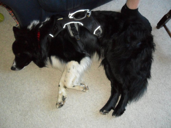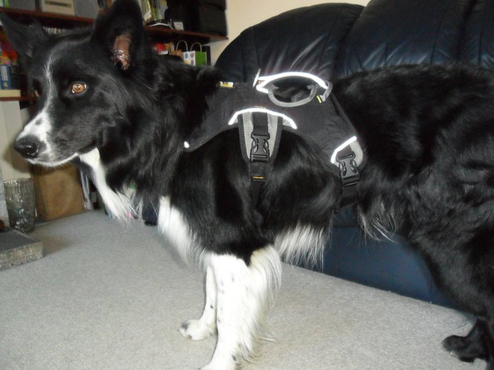 After a day I found the best, and only, harness suited for the job. The Ruffwear Webmaster! Originally designed for search-and-rescue dogs, “the Web Master lets you assist your dog up and down in a variety of situations”…”Ergonomic cut allows for a full range of motion, while still providing security that even the best “Houdini dog” can’t escape”. A number of sites describe the harness as great for “assisting your dog up and down stairs and around the house”! This really amused me as to find this harness I had searched for “active dog harness”. However it is true! This harness is used equally for active outdoor dogs as it is used for older dogs that are unsteady of their feet. So I purchased my harness from Muddy Paws, whose service was excellent I must say. I bought a size Small for my Border Collie after measuring his girth as described on the websites and purchased the black version.