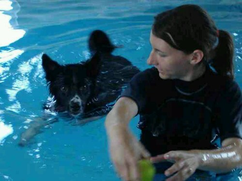 I wanted to work on Guinness’ fitness and he has a slightly wonky pelvis and therefore a weaker side, so Lorna taught me how to get him to swim around me. This is a lot like agility commands of sending the dog around a wing or around an object, or like heelwork to music getting the dog to go around you. The only difference is that they’re swimming!