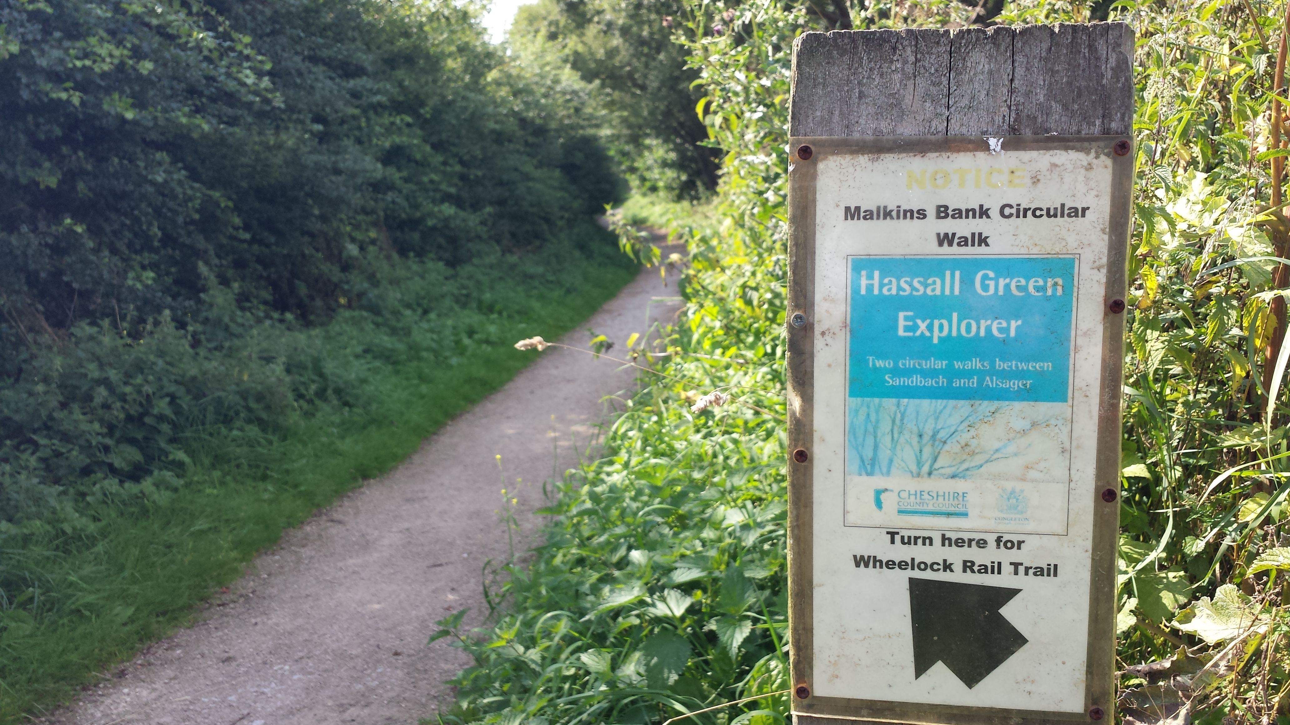 On the canal we passed under the M6 and past Malkin’s Bank Golf Course until we reached the fabulous sign that indicates the way to the Wheelock Trail. Forgetting about the M6, there is some stunning Cheshire agricultural countryside along this stretch of the canal, with grazing pastures of cattle and horses and buzzards and swallows flying overhead.