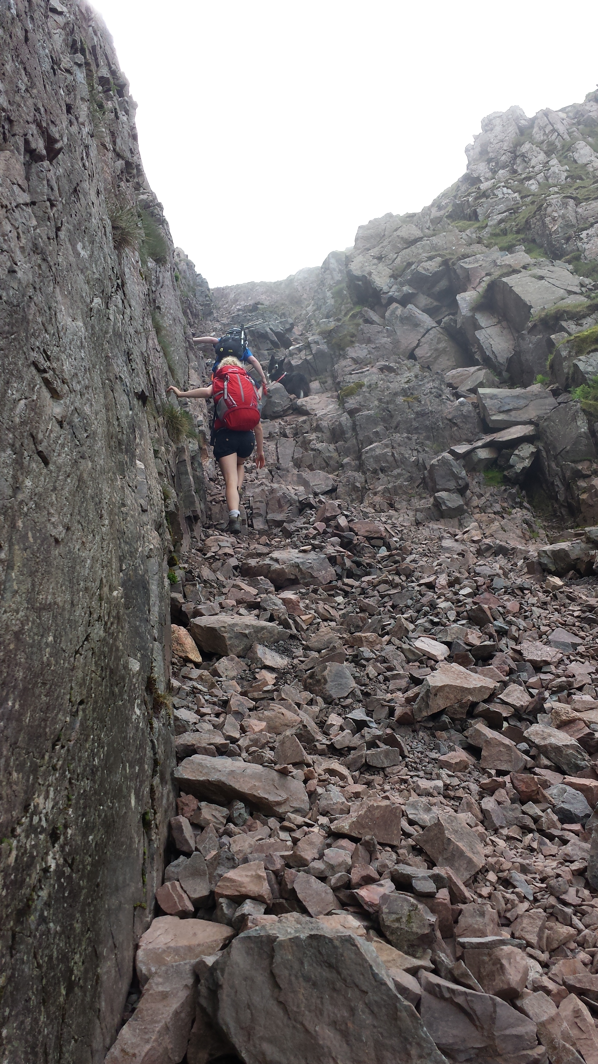 So I stood there struggling to breath and I honestly thought, I can’t do this. I’m going to have to go back and leave them to it. Luckily Ash was ahead, because if he had been next to me I would have told him I was going back. I stopped and sat down and nearly shouted ahead to him. I shook myself and carried on and caught up to them. He asked if I was okay, with watery eyes I said “Yes” and we kept going. We both knew I wasn’t really. Each time we stopped I laughed and said “I’ll meet you at the top. There’s no rush. I’ll get there eventually”. Nearly two hours later we reached the final steep scree section of Mickledore. Ash went behind me in case I slipped (not because I was struggling, but because I am generally clumsy and trip over air). As we started this section I felt much better. We were past halfway and doing quite well for time. I wasn’t being that slow.