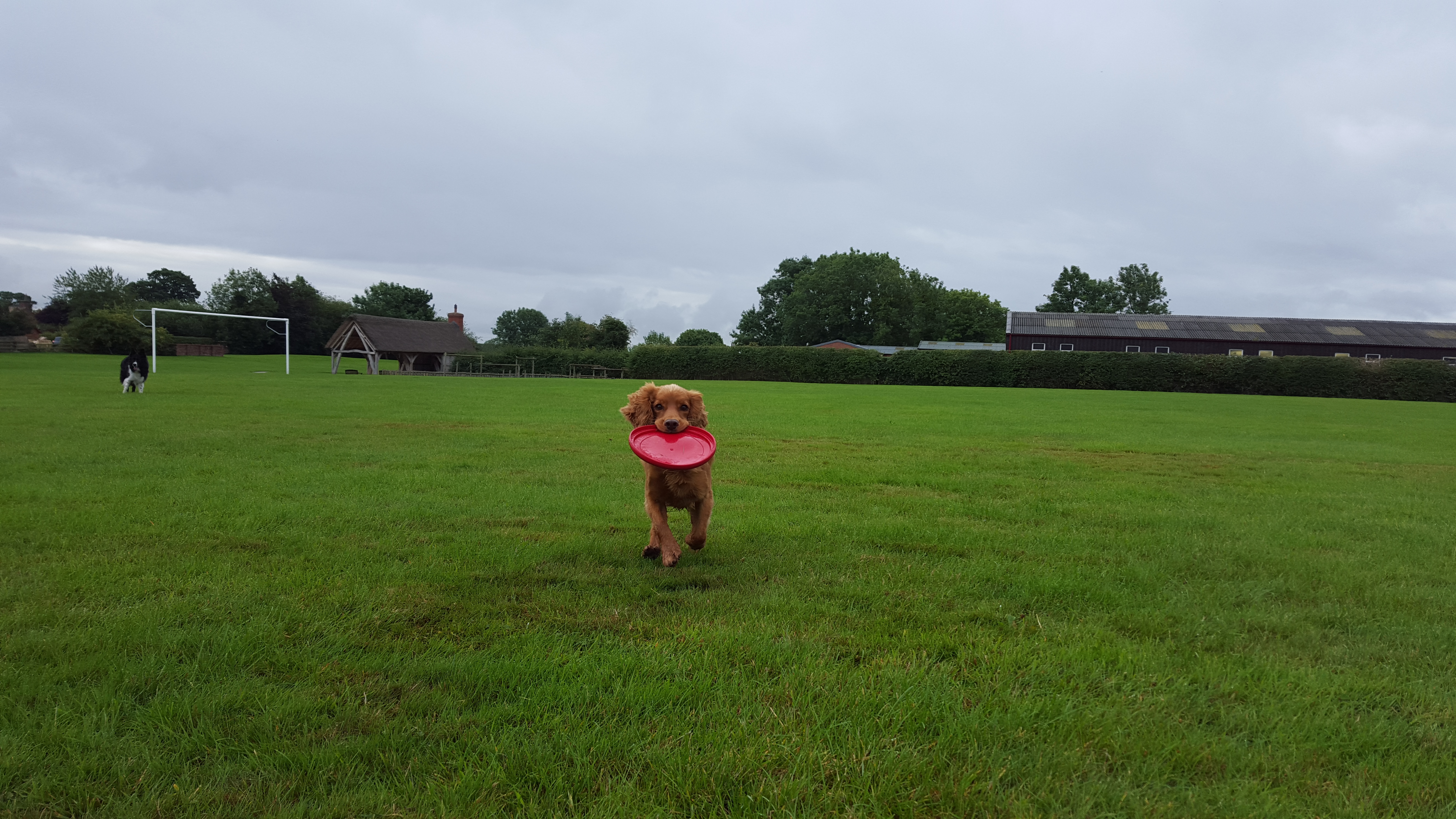 Guinness has been catching it and carrying it around with ease and so far it hasn’t got a single mark on it. I’ve also been testing it with Freddie the Cocker Spaniel and although it seems a little big for him to carry he still manages just fine. I bought the Large size but the Medium would probably be better for anything smaller than a Springer Spaniel (Freddie is a giant for a cocker).